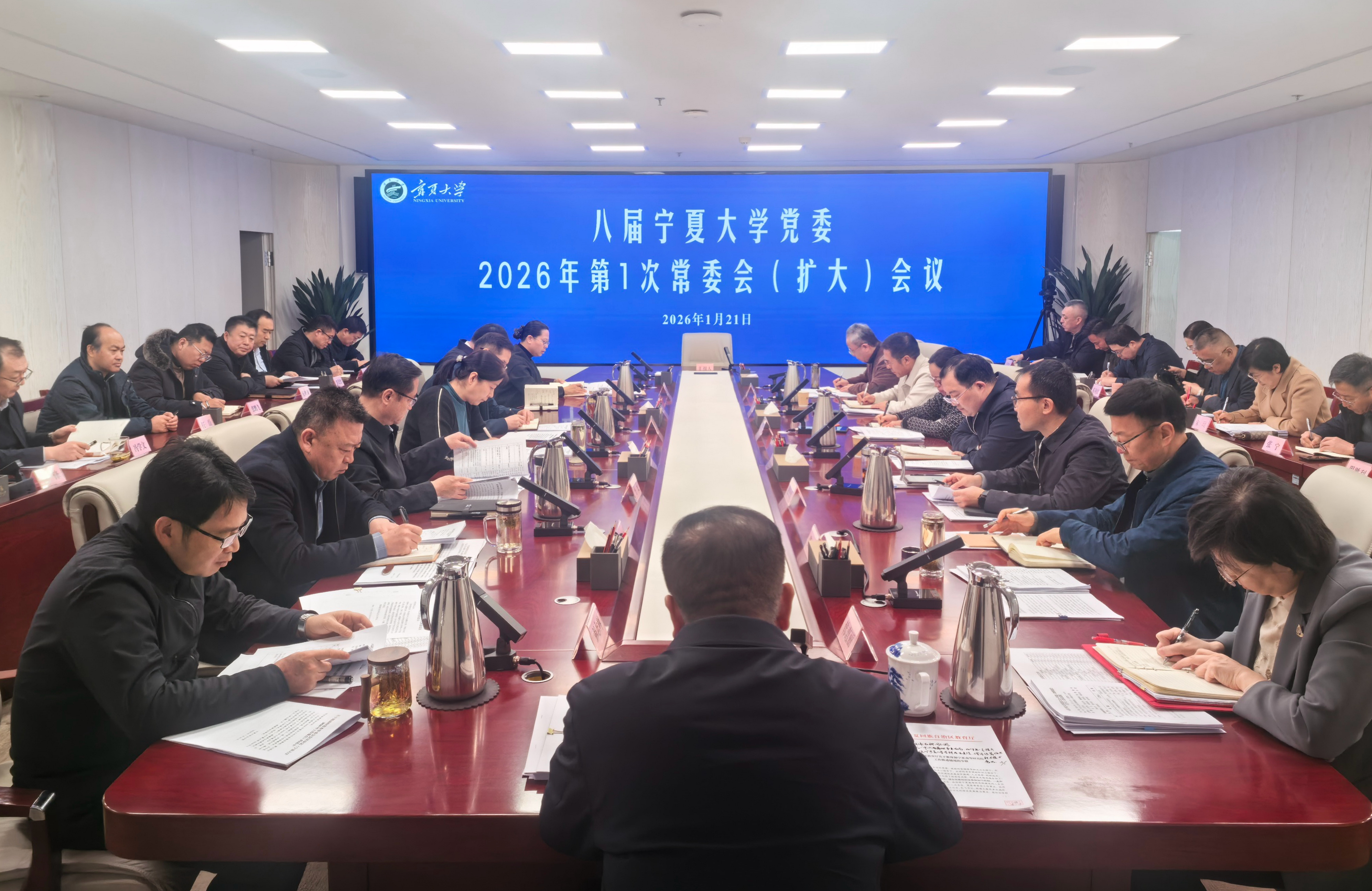 【宁夏大学新闻中心讯 李明花/文、图】1月21日,我校召开八届宁夏大学党委2026年第1次常委会(扩大)会议,传达学习全国、全区教育工作会议精神,研究贯彻落实意见。校党委书记王宏伟主持会议。