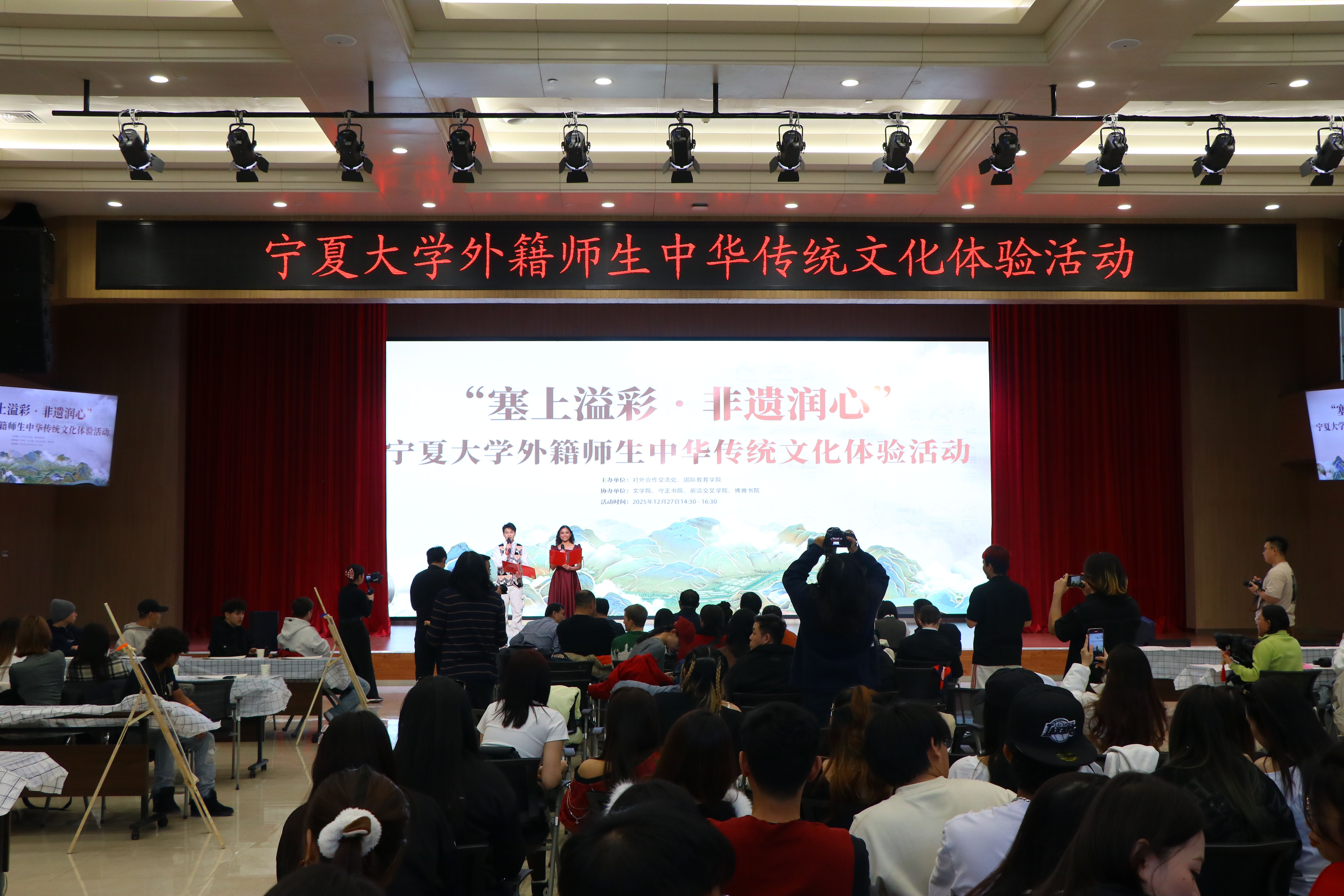 【宁夏大学新闻中心讯 杨雯/文 杨雯 学生记者 田慧文 李紫东/图】12月27日下午,“塞上溢彩 非遗润心”外籍师生中华传统文化体验活动在贺兰山校区笃行楼三楼报告厅举办,280多名外籍师生共同感受中华传统文化的魅力,开启了一场别开生面的文化感知与交流之旅。活动由对外合作交流处、国际教育学院主办,守正书院、博雅书院、前沿交叉学院协办,校党委副书记韩惠丽,校党委常委、副校长杨文法参加活动。