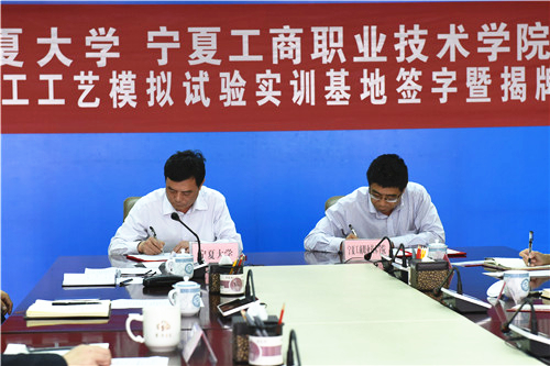 我校社会服务处处长刘成敏与宁夏工商职业技术学院实训装备处处长梁军签署共建协议。