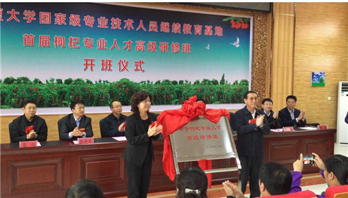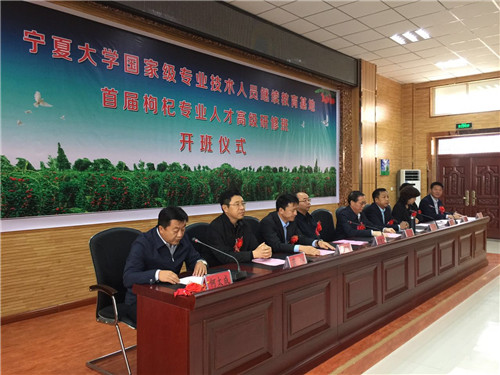 自治区人社厅副厅长马力、林业厅副厅长平学智、中卫市委常委、县委书记陈建华、我校副校长王春秀以及宁夏职业园区管委会副主任陈晓军等领导出席了开班典礼,中宁县委常委、组织部长何太成主持了开班仪式。马力和王春秀共同为“中宁枸杞专业人才高级研修班”揭牌;陈建华、平学智、王春秀先后致辞。
