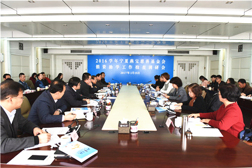 【宁夏大学新闻中心讯 张景/文 龚旭峰/图】3月15日,2016学年宁夏燕宝慈善基金会捐资助学工作调研会在我校召开。区教育厅副厅长王春秀,宁夏燕宝慈善基金会秘书长马冬梅,我校党委书记金能明、副校长马应虎,北方民族大学副校长张维民,宁夏医科大学副校长何仲义参加调研会。区教育厅学生资助管理中心副主任李秀芝主持会议。