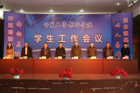 【宁夏大学新闻中心讯 新华学院/图、文】为全面总结学生工作,表彰先进、树立典型,推动学院学生工作健康、持续发展。12月24日下午,新华学院在大学生活动中心成功举办学生工作会议。新华学院党委书记周学峰,党委副书记、常务副院长郭少新,党委副书记张龙,副院长雍少华、周波、宗力,财务总监马萍出席了会议,各系、各部门负责人,学院一线辅导员及学生代表出席了会议。会议由学院党委副书记吕海军主持。