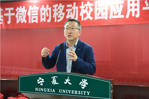 校党委金能明书记对宁夏大学基于微信的移动校园应用平台正式开通表示祝贺,对内蒙古华腾有限公司对我校的厚爱和高等教育的支持对表示感谢。金能明要求,各级各单位领导要解放思想,提高认识,重视教育的信息化。学校在向西部一流大学发展和“十三五”建设过程中,综合改革到哪里,信息化服务工作就要紧紧跟到哪里,全面助推学校发展。学校还要在人才培养、科学研究、社会服务等方面与内蒙古华腾公司提升合作的层面,不断提升我校教育信息化水平。