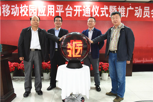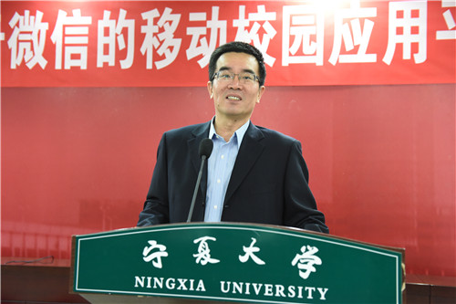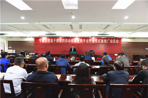【宁夏大学新闻中心讯 胡玥/文 龚旭峰/图】5月4日,宁夏大学基于微信的移动校园应用平台开通仪式暨推广动员会在贺兰山校区行政楼6楼会议室举行。校领导金能明、赵利宁、谢应忠、田军仓和信息化领导小组成员参加了开通仪式。