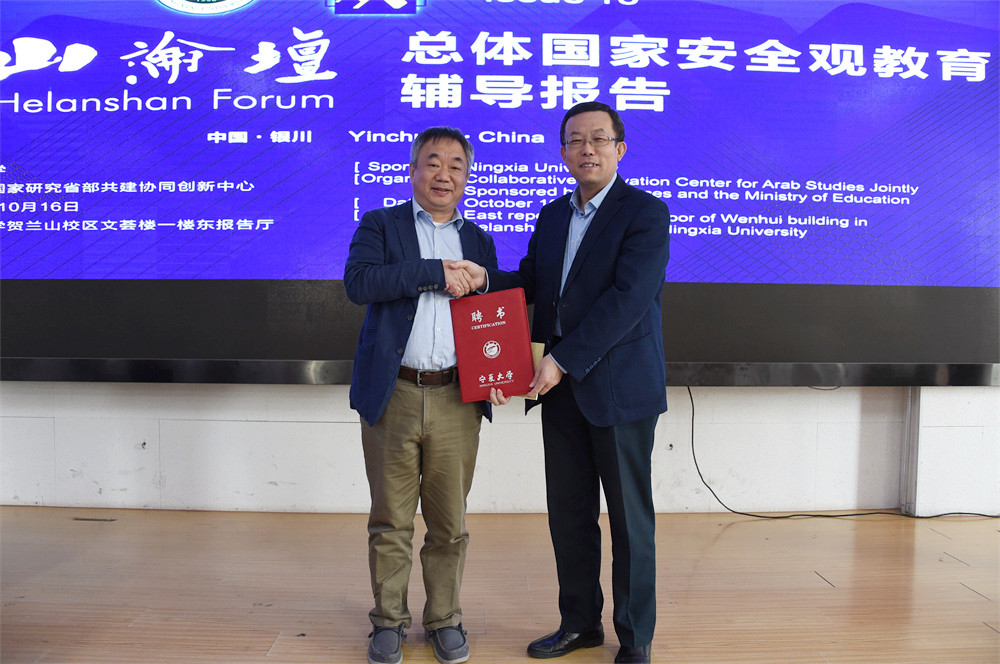 【宁夏大学新闻中心讯 龚旭峰/文、图】为深入学习贯彻习近平总书记关于总体国家安全观的重要论述,提高我校党员干部和师生国家安全意识,结合党史学习教育工作要求,10月16日,中国社会科学院美国研究所研究员、博士生导师、党委书记兼所长,著名国际问题专家倪峰应邀做客我校贺兰山论坛,为干部师生作了题为“当前的中美关系与拜登政府对华政策走向”的总体国家安全观教育辅导报告。校领导王玉炯、周运生、李建设、刘炎胜、周震出席报告会,宁夏大学中国阿拉伯国家研究院院长李绍先主持报告会。