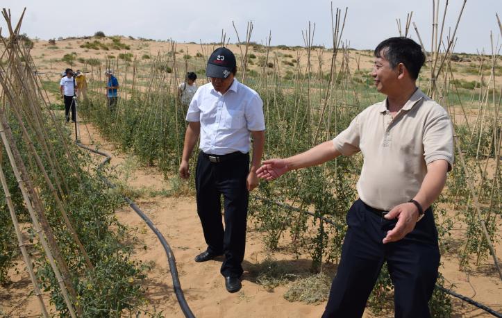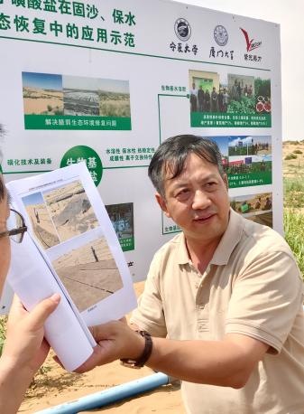 尹教授介绍说,我国荒漠化土地面积有260多万平方公里,沙漠化是我国当前最为严重的生态环境问题之一。沙漠治理是一个全球性的挑战,现行的沙漠治理方法有三类:工程治沙、化学治沙和植物治沙,这些方法在沙漠治理中发挥着积极的作用,但是这三类方法不能从根本上恢复沙漠生态。与宁夏大学的这个合作项目提出的生物基固沙方法是一种生态治沙方法,生物基固沙剂具有保水保肥、提高沙子团粒结构、自然降解、促进微生物生长的多重功能,对沙漠生态恢复工程有积极的示范和推广作用。项目在创新驱动发展方面,鼓励东西产学研合作,协同创新,通过项目牵引,柔性引进东部人才智力技术资源落户宁夏。项目在脱贫富民战略方面,可以扩大农牧种养土地资源,增加种养品种,实现种养互补,为农牧户减支增收。在生态立区战略方面,可以提高沙旱植物经济价值,提高地方与农户种植积极性,具有较强的实用性,应用推广前景广阔。