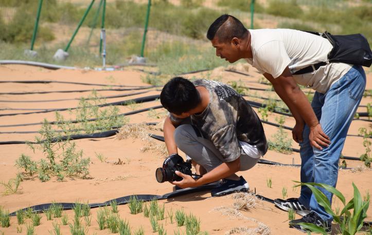 由赵玉芬院士带队的专家组驱车走进位于内蒙古阿拉善乌斯泰镇的乌兰布和沙漠腹地,正当大家被一路荒凉、寂寥的视野搞得困意恹恹时,车停在了在一块南北长条形的沙坡边。顺着内蒙古阿拉善盟乌兰布和沙漠生态产业示范园区党工委副书记、副主任田学文手指的方向,一片明亮如绿宝石的“植被”让大家睁大了眼睛。
