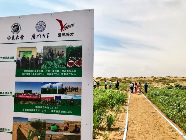 示范田里“宁夏大学与厦门大学合作的科研项目介绍牌”如田埂上的一棵树,非常引人注目,项目名称“多功能水溶性生物基高分子磺盐酸在固沙、保水、供肥以及沙漠和盐碱地生态恢复中的应用示范”特别醒目。