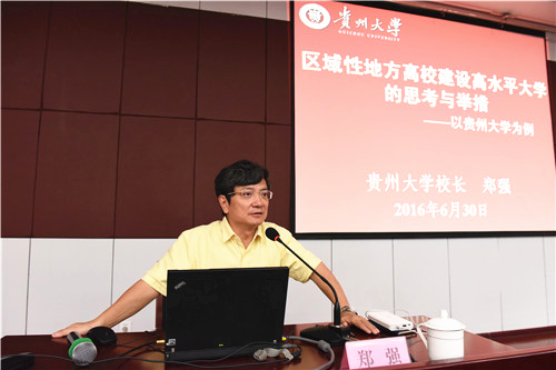 报告中,郑强从国内外高校的功能与定位、贵州大学发展的思路与举措、中国教育若干热点问题的思考等三个方面阐述了区域性地方高校建设高水平大学的深刻思考。在谈到国内外高校的功能与定位时,他强调,一个大国、强国要有政治上的决定力、经济上的影响力、军事上的威慑力、制度上的信赖力、文化上的感召力关键在于教育,在于高水平大学的支撑。高水平大学是杰出人才的培养地、高端人才的吸引盆、高端科技的发源地,是一个国家、地区经济社会发展和工业持续进步的决定性因素。他指出,有高水平大学,才能引进一流人才,用好一流人才,留住一流人才,才能更好地增强地方高端人才吸引力,尖端科技汇集力,并通过吸引人才,汇聚人才来推动经济社会的持续发展。