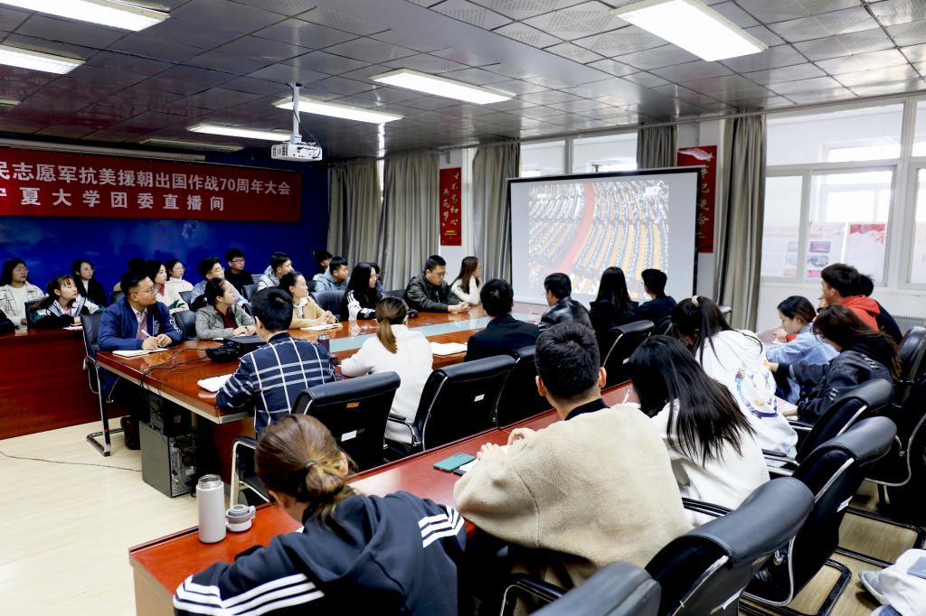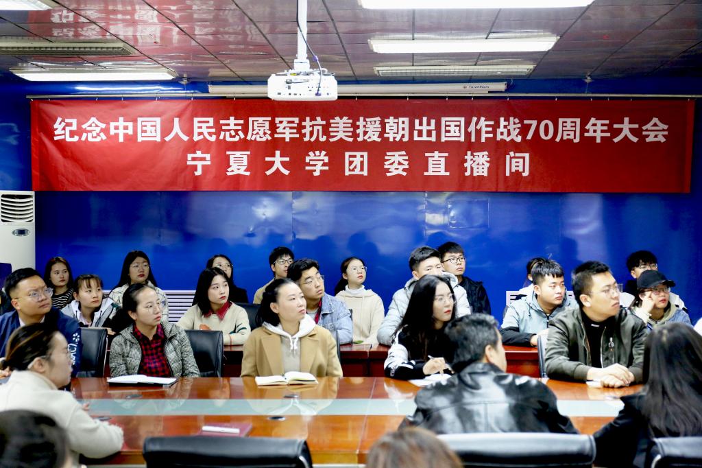 【宁夏大学新闻中心讯 校团委】10月23日上午10时,宁夏大学组织广大师生通过电视收看了纪念中国人民志愿军抗美援朝出国作战70周年大会直播。