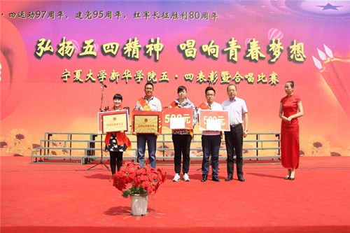 【宁夏大新闻中心讯 新华学院 党委工作部】5月4日下午,新华学院纪念五·四运动97周年表彰大会暨合唱比赛在中心区操场举行。新华学院党委副书记、常务副院长郭少新,党委副书记吕海军,学院副院长雍少华、刘军红、周波、宗力,财务总监马萍出席了表彰大会,并为获奖集体和个人颁奖;各相关部门、各系负责人,各学办主任、团总支书记、辅导员以及全体在校生参加了此次活动。表彰大会由团委副书记白雪军主持。