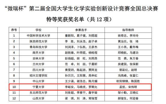 全国大学生化学实验创新设计竞赛分为大区赛、总决赛两个阶段,来自全国超过800支队伍参加比赛。在西北赛区比赛中,由化学化工学院学生李峪安、马晓虎、罗期允和指导教师孟哲、宋伟明组成的我校代表队获得西北赛区一等奖,成为宁夏高校唯一入围全国总决赛的队伍。总决赛中,我校团队奋勇拼搏,同来自中国科学技术大学、浙江大学、同济大学在内的90支代表队展开激烈角逐,最终以优异成绩荣获特等奖。这是我校化学一流本科专业建设中取得的又一佳绩,也是我校紧紧围绕立德树人根本任务,全面提高人才培养质量的又一硕果。