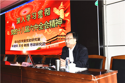 【宁夏大学新闻中心讯 胡玥/文 龚旭峰/图】11月30日,自治区党委党史研究室主任宋建钢来校作学习宣传贯彻党的十八届六中全会精神专题学辅导。校党委常委、校领导,全校副处级以上领导干部,马克思主义学院全体专任教师参加了报告会。