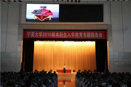 【宁夏大学新闻中心讯 国防生记者站 栾毅/文 冯凯 苏宇静/图】9月19日下午,在C区大学生活动中心里人声鼎沸、掌声雷动。随着学生处张少华副处长的“欢迎英雄回家”的致辞,2015级新生迎来了一名特殊嘉宾——体育学院2012级孙海强。他是“9·3”抗战胜利70周年受阅官兵之一,也是宁夏大学唯一一位参加阅兵式的士兵。