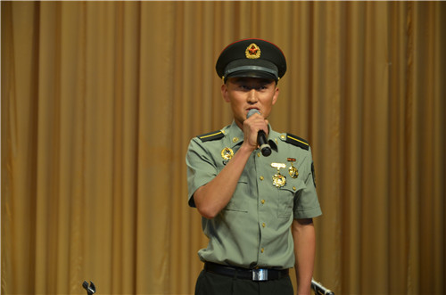 整齐的军装、挺拔的军姿,和着分列式般的掌声,昂首阔步,走向主席台,为新生呈现了一场别开生面的优秀大学生士兵的精神风貌。从普通的大学生到大家心中崇拜的英雄,他激动地讲述着自己的人生历程:当初义无反顾的选择当兵,在喀什暴乱中维护当地群众生命安全,并帮助居民种棉花、盖房,后成为一个幸运儿被选拔到阅兵式的队伍中参加阅兵训练,从新疆到北京,近乎一年的艰辛历程,喊口号嗓子沙哑、站军姿六小时双腿麻木、齐步走每天至少20公里、抗疲劳训练24小时不眠不休······阅兵当日,他所在的部队为履带自行火炮方队,欣喜之情难以言说。他的语言质朴而真诚,一言一行都激励着每一位2015级军训新生,“人生的选择有很多,贵在把握,成在坚持”,经历了严苛的受阅官兵选拔程序的他由衷说道。与新生共勉,为军训加油鼓劲。