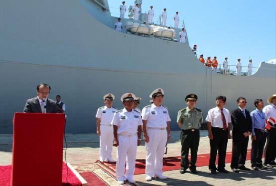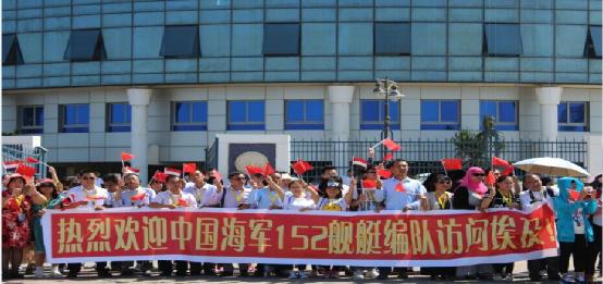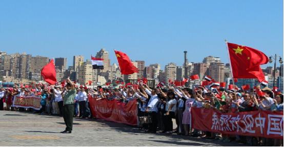欢迎仪式在挥舞的五星红旗和嘹亮的国歌声中拉开序幕。中国驻埃及大使馆临时代办齐前进代表领事馆和所有华人华侨对152舰艇编队在抗战胜利70周年纪念日前夕的来访表示热烈的欢迎,152舰艇编队指挥员、海军东海舰队副参谋长王建勋使馆和广大华人华侨对舰队到访埃及的欢迎表示衷心感谢,并表示海军时隔六年再次到访埃及是友好与和平之旅,为期5天的友好访问将包括高层拜会、舰艇开放、反恐经验交流、两国海军官兵文体比赛在内的一系列活动,这对彰显中国军人风采、促进中埃军队交流具有重要意义。