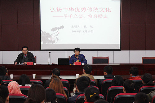 讲座中,孔斌从正确认识和对待传统文化、传统文化的核心思想以及尽孝立德等几个方面介绍了什么是“德”,并结合自己的亲身经历告诉师生要牢记传统文化的核心思想“道德”。她认为,“道”为做事情要顺应自然规律,“德”为注重自己的德行修养。而“孝乃德之本”,所以人们首先应该学会尽孝道。孔斌还利用典型生动的故事告诉学生,百善孝为先,自古孝子出贤才,以孝养德,德才皆能兼备。心存感恩,对父母尽孝,这样的人活着才能对社会有所贡献。同时,她对大学生提出希望:从孝做起,尽孝立德,做有理想、有道德的人。