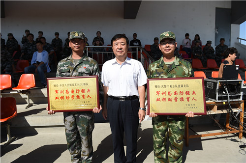 表彰会上,与会领导为获得本次军事技能训练先进单位和先进个人代表颁奖,何建国校长为承训部队授奖牌。