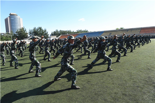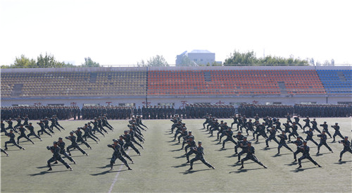 阅兵总指挥军训团团长魏国孝宣布阅兵式开始。各营连方队迈着铿锵有力的步伐,喊着响亮的口号,精神抖擞地走过了检阅台。阅兵式结束,2016级军训学生表演了精彩的刺杀操、军体拳,音乐学院合唱队表演了军歌大合唱,武警总队宁夏直属支队进行了擒拿表演。
