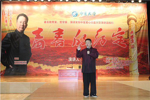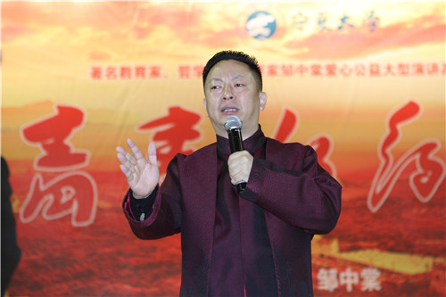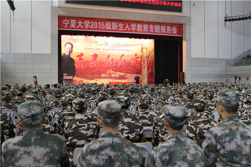 【宁夏大学新闻中心讯 胡玥/文 龚旭峰/图】9月15日上午,中国企业家哲学研究会会长邹中棠公益演讲高校行活动在C区大学生活动中心举行。校党委副书记赵利宁和我校优秀校友宁夏新闻出版广电局局长杨宏峰,寰玥财富(北京)投资管理有限公司银川分公司总经理李姜,宁夏中房集团副总经理张君以及各学院从事学生工作的老师、2015级新生近5000人一同聆听了演讲。