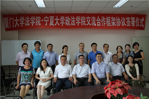 【宁夏大学新闻中心讯 金桂琴/文 虎建华/图】8月8日,厦门大学法学院与我校政法学院在文科楼8楼会议室举行交流合作框架协议签署仪式。厦门大学法学院党委书记李智勇,副院长何丽新、林秀芹,肖伟教授,我校党委书记金能明与党办、政法学院负责人、部分教师代表参加了会议。