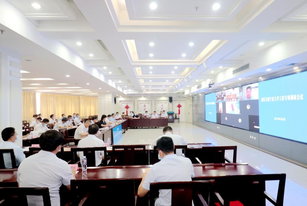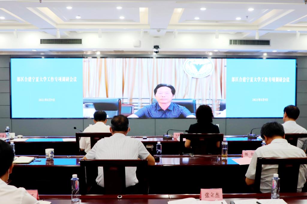 【宁夏大学新闻中心讯 张景 王文娣/文、图】8月9日,以浙江大学副校长黄先海为组长,教育部发展规划司基本建设处二级调研员曹飞、教育部高等教育司理工科教育处副处长沈国清为副组长的10位专家组成的教育部第四调研组,采取线上形式对我校“部区合建”工作进行专项调研。宁夏教育厅副厅长王春秀、我校全体在家校领导出席会议。会议由校党委副书记、校长何建国主持。