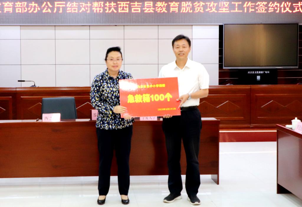 随后,何建国与杨生俊共同签订了《宁夏大学协助教育部办公厅结对帮扶西吉县开展教育脱贫攻坚工作协议》,西吉县委常委、政府常务副县长李国英代表县委、政府接受我校捐赠的急救箱。