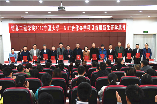 宁夏大学副校长谢应忠、NIIT全球副总裁、中国区总裁柯谋、自治区外事办公室副主任胡云岭、自治区教育厅国际合作与交流处处长孙忠铭和NIIT项目方代表参加了开学典礼。信息工程学院党委书记武林波主持了典礼。