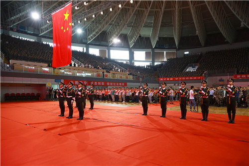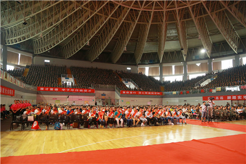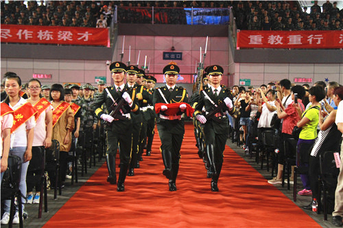 校学生会主席马娜带领全体2016级新生郑重宣誓:“自尊自信,自立自强。尚德勤学,求是创新。热爱祖国,崇尚科学。诚实守信,遵纪守法。尊师爱校,敬重父母。脚踏实地,志存高远”。