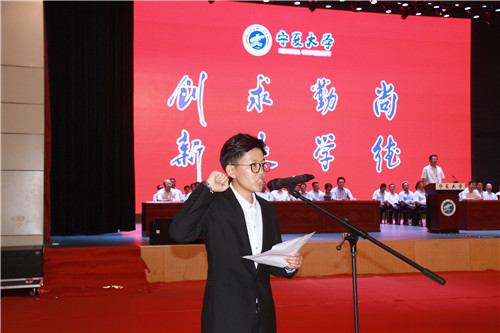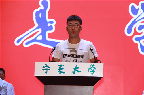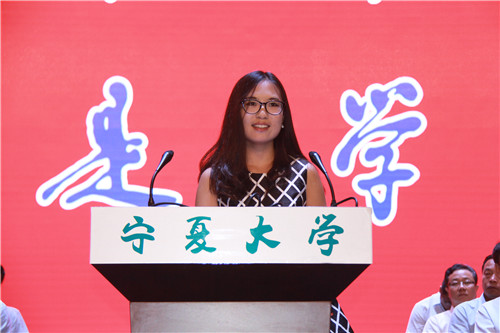 教育部人文社科重点研究基地、宁夏大学西夏学研究院院长、“长江学者”杜建录教授代表教师发言。他表示,人生历程中,大学阶段非常重要,它是储备知识、训练思维、培养人格的重要阶段,是最容易接受知识、形成世界观的阶段,谁把握住了大学的生活,谁就把握住了未来。他希望同学认真读书,走进图书馆,充分利用我校优势特色资源,健康成长,在五彩缤纷的世界里面找到自我、找准方向、明辨是非,做一个心理健康、思想积极、学习优秀的阳光青年,为成为国家和自治区建设的栋梁之才而努力。