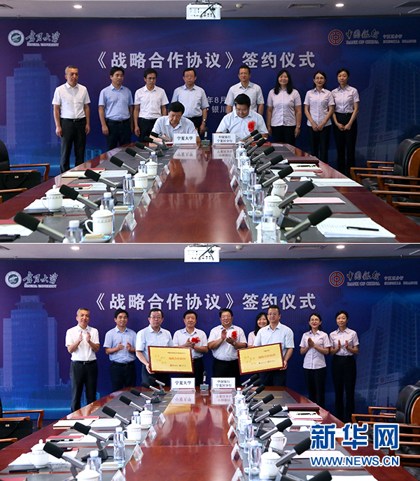 上图为中国银行宁夏分行与宁夏大学签订战略合作协议;下图为中国银行宁夏分行与宁夏大学互赠战略合作伙伴牌匾。(拼版照片)
