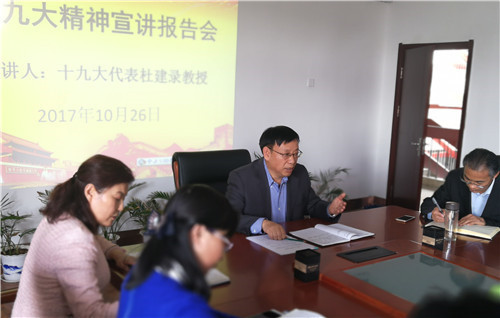 【宁夏大学新闻中心讯 西夏学研究院】为及时、认真宣传贯彻好党的十九大精神,10月26日,赴京参加党的十九大的西夏学研究院院长杜建录教授刚刚返回到工作岗位,就为西夏学研究院师生作了一场精彩的党的十九大精神宣讲专题报告会。