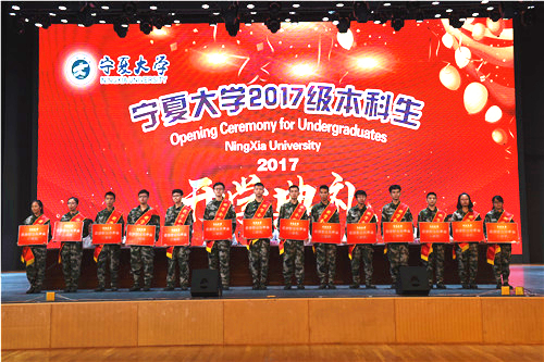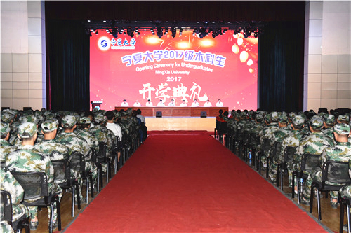 【宁夏大学新闻中心讯 张景/文 龚旭峰/图】9月8日,我校2017级本科生开学典礼在大学生活动中心举行。校领导金能明、何建国、赵利宁、许兴、马应虎、田军仓、周运生及校党委常委、校长助理马涛出席开学典礼。校党委副书记王宏伟主持开学典礼。