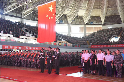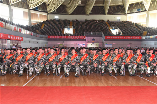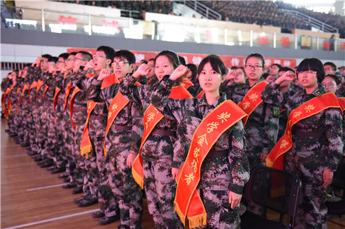 校学生会主席胡桢麟带领4705名新同学共同宣誓:自尊自信、自立自强;尚德勤学、求是创新;热爱祖国、崇尚科学;诚实守信、遵纪守法;尊师爱校、敬重父母;脚踏实地、志存高远。