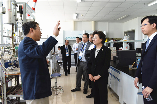 香港工商界代表团一行在谢应忠副校长的陪同、中央人民政府驻港联络办公室副主任仇鸿的带领下,先后参观了我校西夏学研究院和省部共建煤炭高效利用与绿色化工国家重点实验室,了解我校学科建设、人才培养、产学研结合、创新创业等情况。