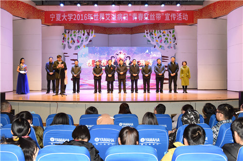 【宁夏大学新闻中心讯 胡玥/文 龚旭峰/图】12月1日,自治区2016年世界艾滋病日青春红丝带宣传活动在我校贺兰山校区音乐厅举行。自治区副主席马力,自治区政府副秘书长吴涛,自治区卫生计生委党组书记黄占华,校领导何建国,王宏伟与北方民族大学、宁夏司法警官职业学院、宁夏工商职业技术学院、宁夏职业技术学院、中国矿业大学银川学院和我校师生代表共同参加了活动。