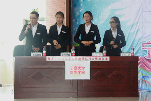本次辩论赛持续两个月,全区共有12所高校参赛,经过选拔赛、复赛、半决赛的角逐,宁夏大学、宁夏大学新华学院两所高校进入决赛展开对决。赛场上,新华学院代表队与宁夏大学代表队就“对待吸毒人员应该以打击惩治为主”与“对待吸毒人员应该以教育挽救为主”这一主题展开激烈辩论。辩手们慷慨陈词、引经据典;唇枪舌战、妙语连珠,语言犀利而不失风度,语言的碰撞、思想的交流,为大家送上一场精彩绝伦的辩论赛事。