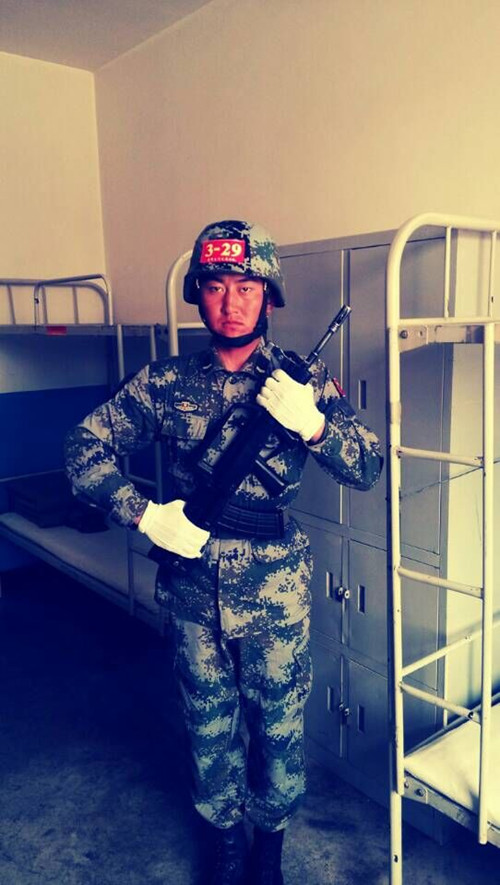 “我曾经是宁夏大学2012级体育学院的一名学生,大一结束时,我报名参军,尽管父母不太支持,但我还是背起行囊,独自远赴新疆喀什开始了军人生涯。”初次来到喀什县莎车县某解放军部队新兵营,一个陌生的城市,荒凉的漫天尘土、不同的生活起居方式都让他无所适从,但高强度的训练迫使他迅速投入,并快速适应。经过短暂三个月的新兵训练,他进入了司令部直属连队。2014年7月28日,新疆发生严重暴恐事件,他所在部队于凌晨5:30迅速赶赴现场,参与一线反恐工作,直至10月中旬才全部撤回,期间,枪炮声、喊叫声不绝于耳。在参与反恐暴力案件期间,他帮助当地村民盖房、修路、种棉花。此次任务,使他获得了优秀士兵的嘉奖和集体二等功的荣誉。
