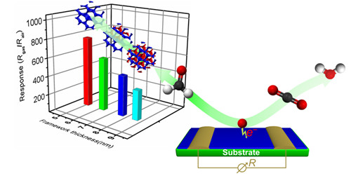 甲醛是一种典型的空气污染物,开发高性能的甲醛气敏材料对监控空气质量、维护人们的生活环境安全至关重要。介孔氧化铬在甲醛气体检测方面有重要的应用潜力。超薄骨架允许暴露更多的活性反应中心,增强气体与材料表面相互作用;而大介孔有利于提高材料的物质传输能力,缩短响应恢复时间。但是通常情况下,介孔氧化铬的骨架较厚、孔径较小,气敏性能有待进一步改善。本研究利用小孔径介孔氧化硅为模板有效限制了氧化铬骨架的长大,厚度可降低至5纳米;同时控制氧化铬在介孔氧化硅两套孔道中的选择性生长,得到间隙孔径可达12纳米的大介孔结构,提高了对甲醛分子的传输与反应能力,获得了显著改善的甲醛气敏响应性能。该成果对于环境污染物检测中气敏元件核心技术开发具有重要理论价值和应用前景。