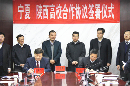 【宁夏大学新闻中心讯 校长办公室/文 龚旭峰/图】为全面落实宁夏、陕西两省区合作框架协议,在两省区教育主管部门的积极联络协调和亲自推动下,经过宁陕两省区有关高校的前期对接沟通,12月16日,宁陕对口高校合作协议签约仪式在自治区教育厅举行。包括我校在内的我区5所高校与陕西6所高校结成对口合作关系。自治区教育厅厅长郭虎、巡视员冀永强,陕西省教育厅副巡视员高晶华及两省区相关高校领导参加了签约仪式。