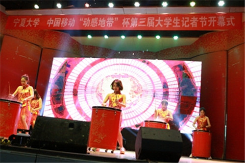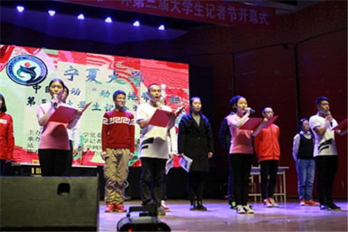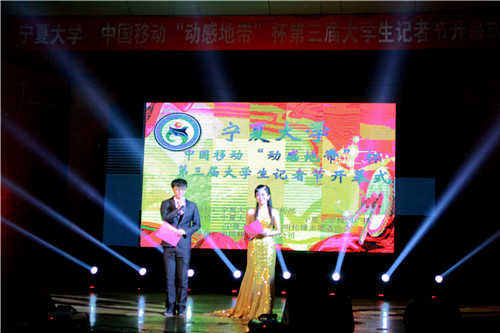【宁夏大学新闻中心讯 学生记者 张娜/文 杨慧/图】11月4日晚,宁夏大学 中国移动“动感地带杯”第三届大学生记者节在A区音乐厅启幕。中国移动宁夏银川分公司党委书记杨建军、高校部总经理王婷与记者团、广播站、网络文明传播志愿者协会和各学院记者站成员及宁夏医科大学、中国矿业大学银川学院记者团的代表一起观看了开幕式。