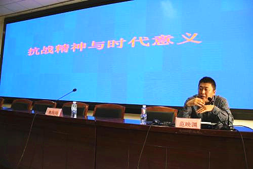 马克思主义学院副书记范映渊做了题为《抗战精神与时代意义》的讲座。他通过大量史实为同学们梳理了中华民族自甲午中日战争起的民族抗战历程,讲解了东北抗联、西安事变等重要历史节点性的历史事物,并以毛泽东的《论持久战》为例,教导同学们多读经典,不断培养自身的爱国精神和爱国情怀。