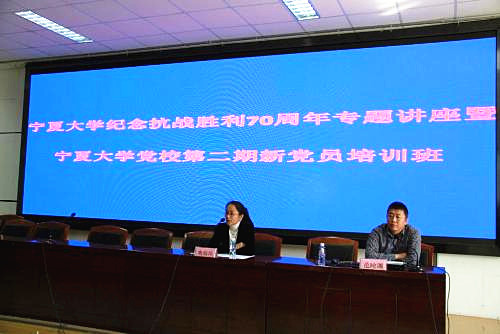 【宁夏大学新闻中心讯 组织部 毕远】10月14日,校党校举办了宁夏大学纪念抗战胜利70周年主题讲座暨学校党校第二期新党员培训班。2015年上半年全校发展的新党员和各学院师生党员代表共计300多人参加了培训,组织部副部长,党建办公室主任奥海玮主持了讲座。