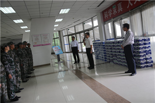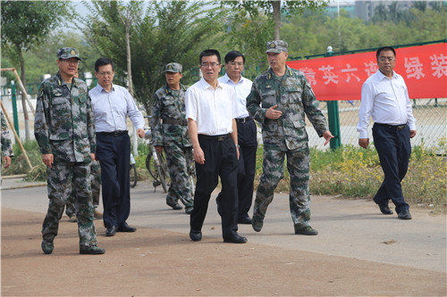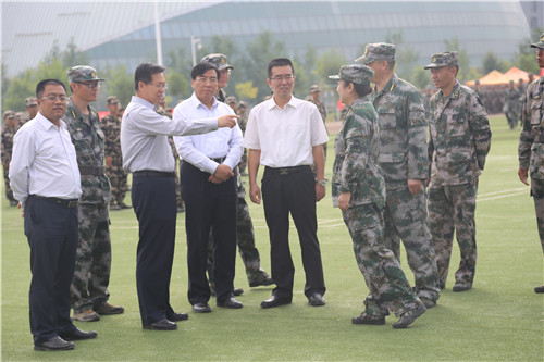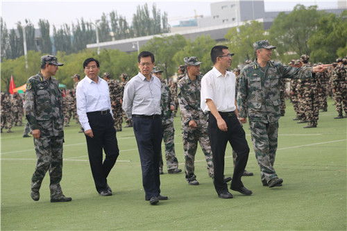 随后,金能明一行前往C区训练场看望了正在训练的学生们,听取了军训团团长魏国孝关于我校学生军事课教学情况汇报,特别是2015级学生军事训练的科目及实施情况。并同宁夏军区给水工程团的帮训教官进行了亲切交谈。