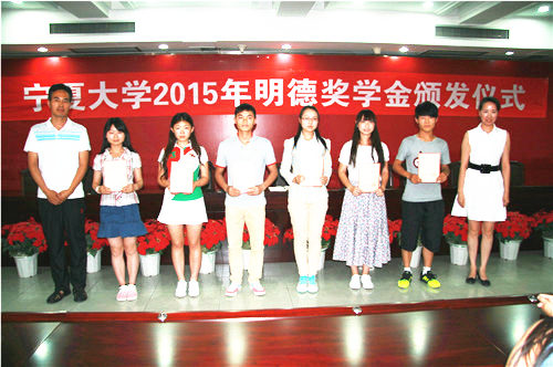 【宁夏大学新闻中心讯 何文栋/文、图】6月17日,宁夏大学2015年“明德奖学金”发放仪式在A区主楼六楼会议室举行。学生资助管理中心负责人,各学院负责资助工作的老师和“明德奖学金”获得者学生代表100多人参加了仪式。