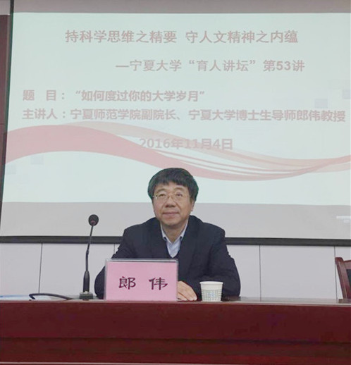 【宁夏大学新闻中心讯 学生处】11月3日晚,我校第53期“育人讲坛”在怀远校区研究生楼二楼报告厅举行。宁夏师范学院副院长、我校博士生导师郎伟教授应邀为2016级新生作了“持科学思维之精要,守人文精神之内蕴”为主旨的宁夏大学2016年科学精神与人文精神系列报告会首场讲座。学生处处长罗进德主持了报告会。