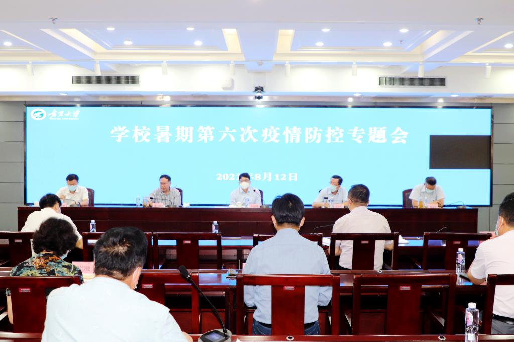 【宁夏大学新闻中心讯 张景/文、图】8月12日,我校召开暑期第六次疫情防控专题会议,就学校疫情防控工作和做法进行再部署、再细化。校领导彭志科、王玉炯、谢应忠、周运生、刘炎胜、周震、史金龙出席会议,校长彭志科主持会议。