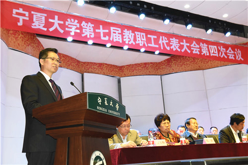 大会号召,全校教职员工要在校党委的领导下,以中国特色社会主义理论体系为指导,深入贯彻党的十八大,十八届二中、三中、四中、五中全会及习近平总书记系列重要讲话精神,坚持创新、协调、绿色、开放、共享的发展理念,认真落实《宁夏大学“十三五”事业发展规划(草案)》《宁夏大学综合改革方案(2016—2020)(草案)》任务,凝心聚力、提振信心、真抓实干、开拓奋进,为建设“区域特色鲜明、服务地方能力突出、西部一流的高水平教学研究型大学”而努力奋斗。