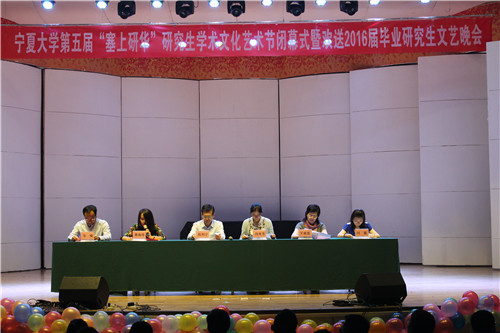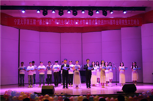 【宁夏大学新闻中心讯 校研究生会 王汉晨 赵志军/文许婧/图】6月3日晚,第五届“塞上研华”研究生学术文化艺术节闭幕式暨“依依宁大,凤凰花开”欢送2016届毕业研究生文艺晚会在贺兰山校区音乐厅举行。校党委副书记赵利宁及党委组织部、党委宣传部、团委、研究生院相关部门负责人,2016届全体毕业研究生,部分在校研究生参加了本次活动。
