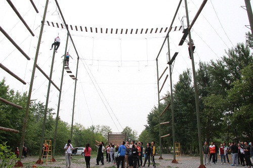 随后,全体参训队员抵达新牛山庄素质拓展基地进行拓展训练。此次素质拓展训练包括“团队组建”、“救火英雄”、“高空挑战”等项目。高空项目充满着挑战与超越,队员们有恐惧,有迟疑,更有鼓励、有感动,大家坚信自己不是一个人在前进,背后鼓励的、支撑的是整个团队的力量。面对最艰难的“强渡金沙江”项目,三十名队员充当桥墩,两人一组,肩并肩、手握手,单膝跪地用双手将“被困队员”运送过“江”。有疼痛、有坚持、更有意志、有担当。最后,在全体队员的坚持、协作下成功完成了所有训练项目。
